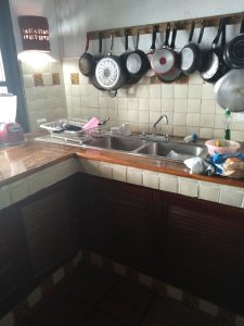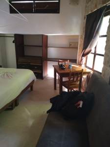 The driver dropped me off right in front of the hotel. I looked around and saw a street full of fences, gates, cars, and motorcycles. Nothing looked like your typical US hotel. Luckily, a member of the hotel staff saw me pull up and came outside to meet me. After I signed in the hotel staff member took me across the street to my room. I loved my room. There was a big bed, a canopy around the bed, a couch, two wooden chairs, a table, water cooler, a mini fridge, microwave, hot plate, dishes, pots and pans. Everything I needed for a two week stay. Some of the walls were made from big boulder rocks. It reminded me of an old western movie or something you would see in the middle of a jungle. It felt like I was in nature somewhere.