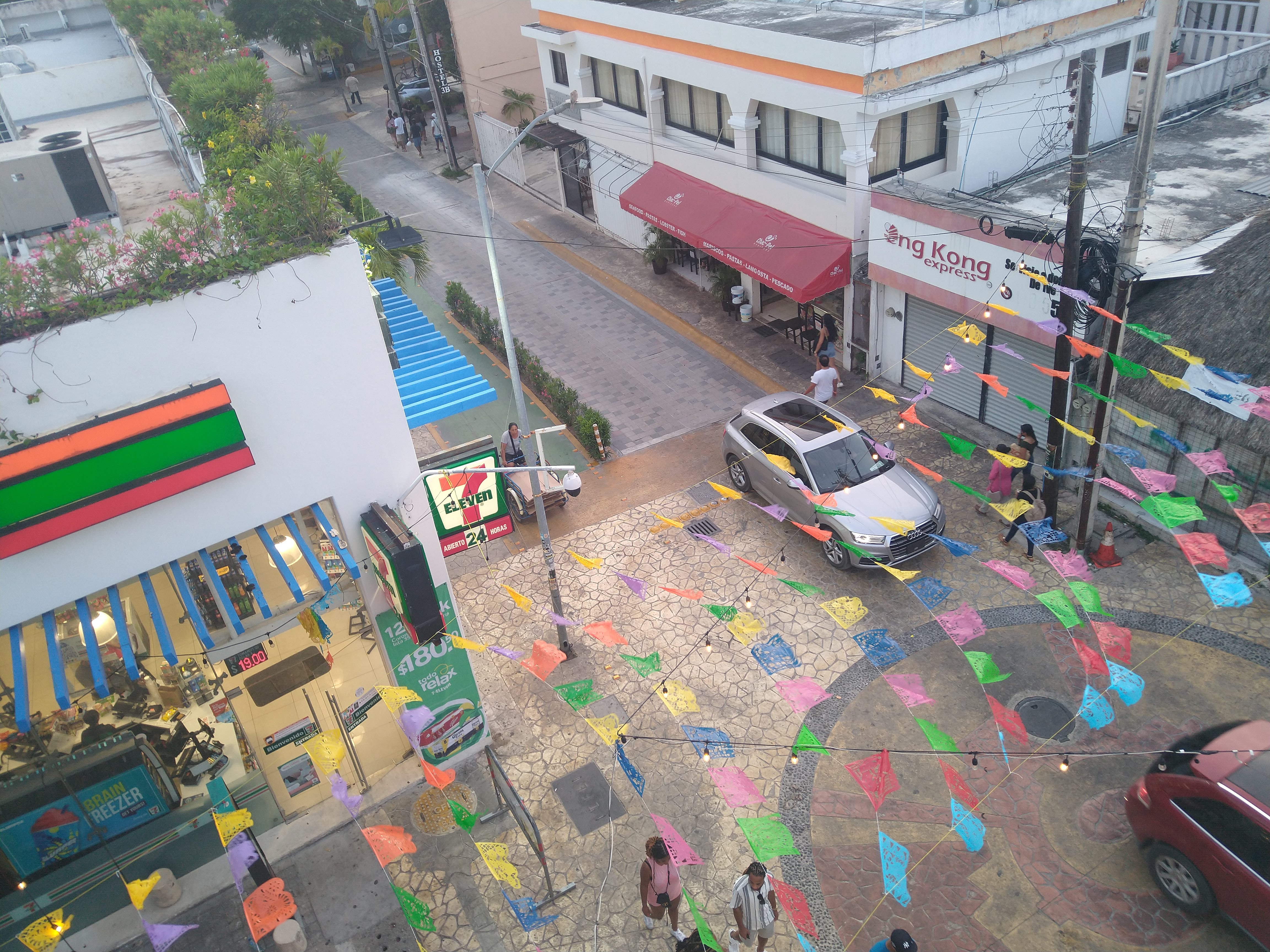 One of the best things about my location was that my hotel was less than a 5 minute walk to the beach. Standing out on the patio I could see the ocean and the waves. At the front of the hotel door were two restaurants, a convenience store, 7-11, and a taxi stand. Once I walked out a little further I could see the Ado bus station (bus to the airport, Tulum and a couple more cities), McDonalds, several shopping stores and more restaurants. At night there was a club very close that played current US pop music.