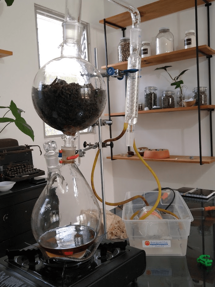 The water in the bottom of the glass container started turning brown from the steam of the leaves above it. The yellow and cords on the right side of the machine are connected to a cold bottle of water. The cold water helps the water and oil separate as it runs into the bottle.